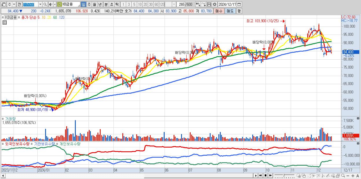 - KB금융 (84,400원 ▼ -0.24% , 시총: 332,138억, 거래량: 1,655,078, 거래대금:1,402억)