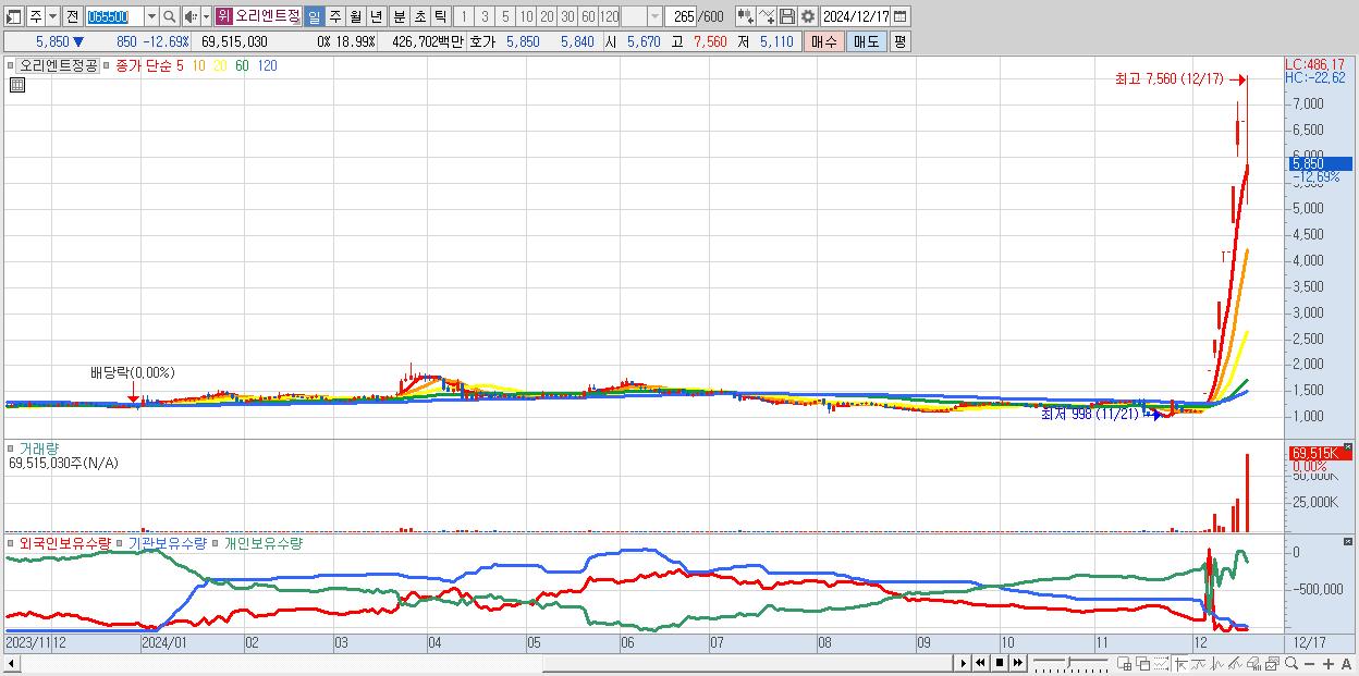 - 오리엔트정공 (5,850원 ▼ -12.69% , 시총: 1,857억, 거래량: 69,515,030, 거래대금:4,267억)