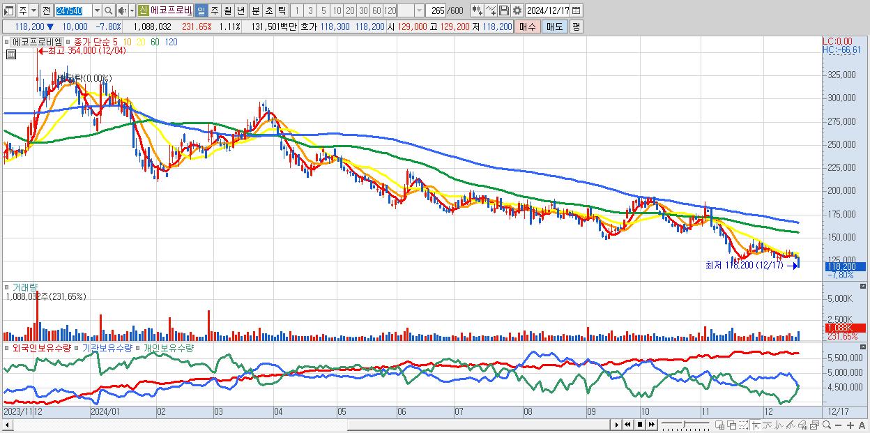 - 에코프로비엠 (118,200원 ▼ -7.8% , 시총: 115,601억, 거래량: 1,088,032, 거래대금:1,315억)