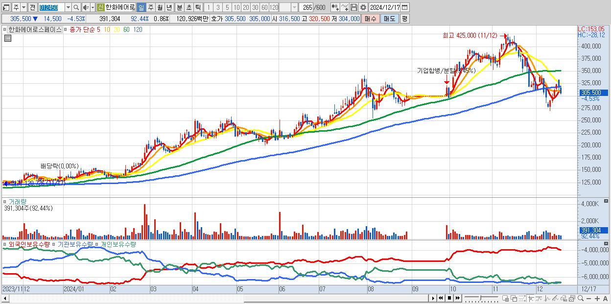 - 한화에어로스페이스 (305,500원 ▼ -4.53% , 시총: 139,250억, 거래량: 391,304, 거래대금:1,209억)
