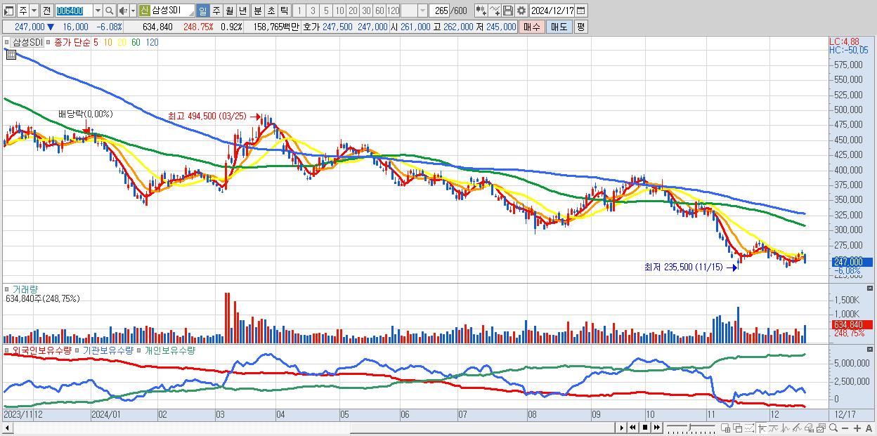 - 삼성SDI (247,000원 ▼ -6.08% , 시총: 169,848억, 거래량: 634,840, 거래대금:1,588억)