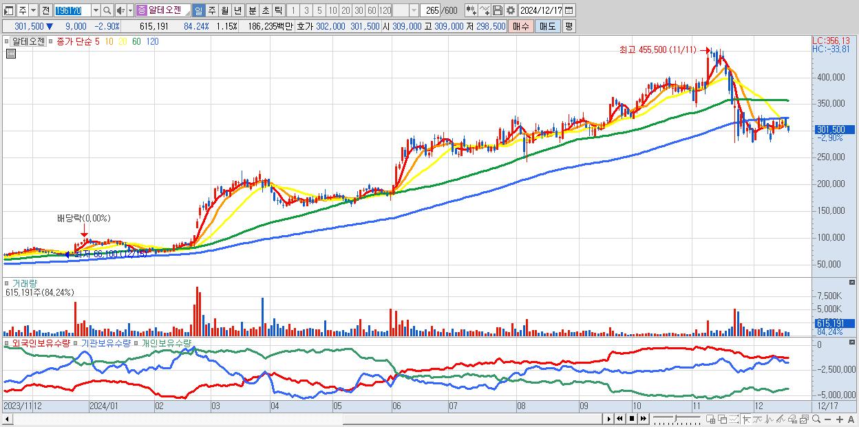- 알테오젠 (301,500원 ▼ -2.9% , 시총: 160,756억, 거래량: 615,191, 거래대금:1,862억)