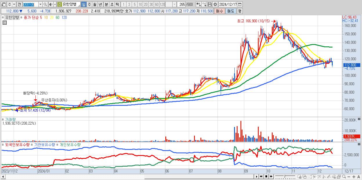 - 유한양행 (112,800원 ▼ -4.73% , 시총: 90,476억, 거래량: 1,936,927, 거래대금:2,190억)