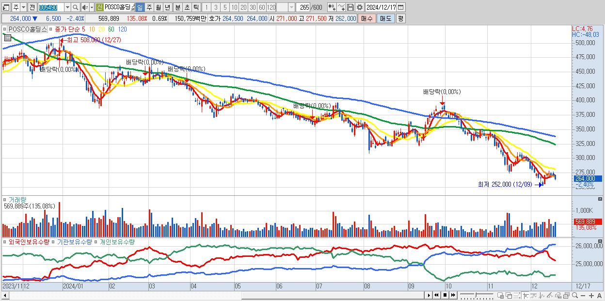 - POSCO홀딩스 (264,000원 ▼ -2.4% , 시총: 218,128억, 거래량: 569,889, 거래대금:1,508억)