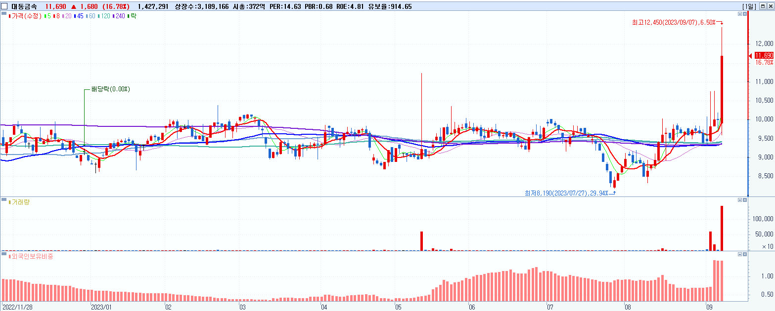 - 대동금속 (11,690원 ▲ 16.78% , 시총: 373억, 거래량: 1,428,323, 거래대금:163억)