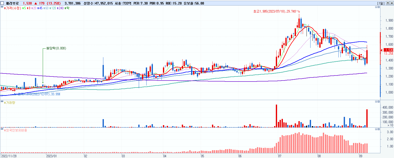 - 체리부로 (1,530원 ▲ 13.25% , 시총: 734억, 거래량: 3,701,453, 거래대금:56억)