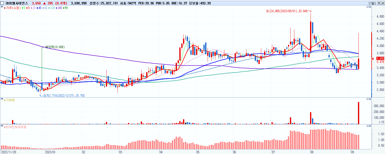 - 아이엘사이언스 (3,650원 ▲ 8.47% , 시총: 943억, 거래량: 3,699,395, 거래대금:143억)