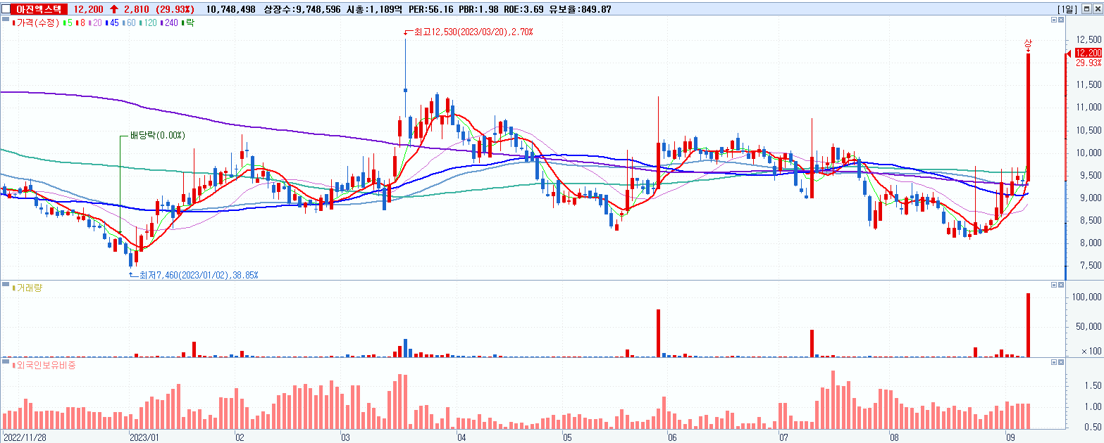 2.아진엑스텍 12,200원 ▲ 29.93% (KOSDAQ, 059120)