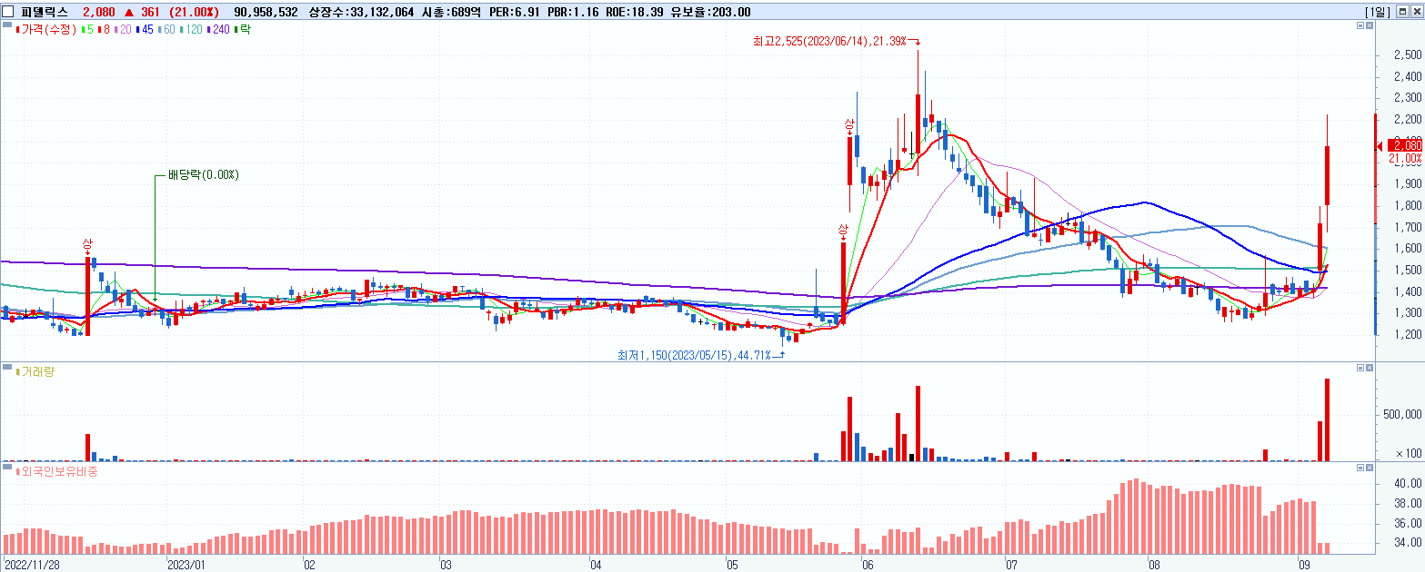- 피델릭스 (2,080원 ▲ 21% , 시총: 689억, 거래량: 91,159,907, 거래대금:1,766억)