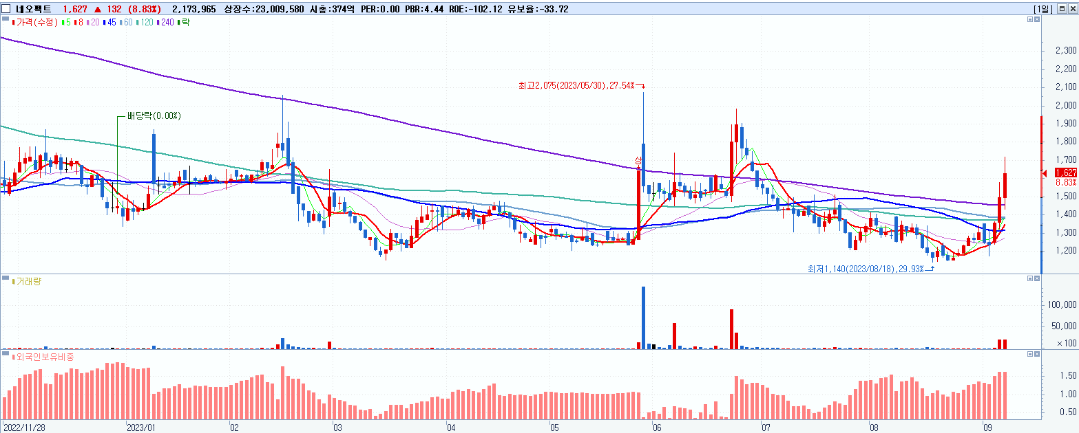 - 네오펙트 (1,627원 ▲ 8.83% , 시총: 374억, 거래량: 2,173,966, 거래대금:35억)