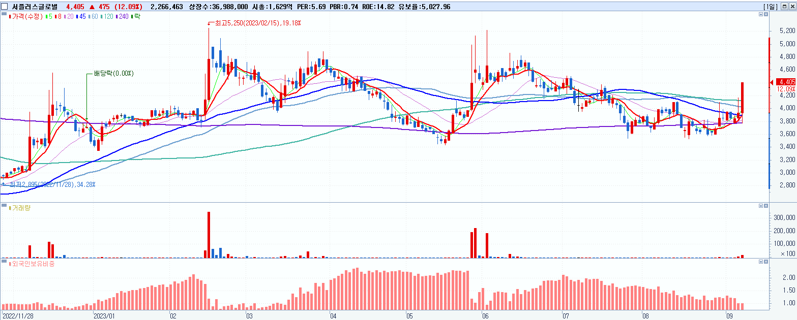 - 서플러스글로벌 (4,405원 ▲ 12.09% , 시총: 1,629억, 거래량: 2,351,933, 거래대금:98억)