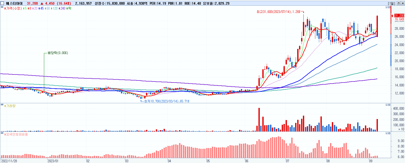 - 에스티아이 (31,200원 ▲ 16.64% , 시총: 4,939억, 거래량: 2,167,014, 거래대금:637억)
