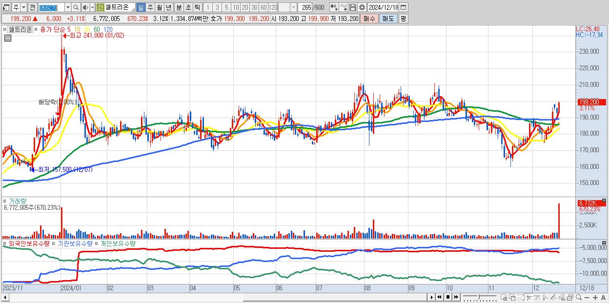 - 셀트리온 (199,200원 ▲ 3.11% , 시총: 432,420억, 외국인 순매수 거래금:86억)