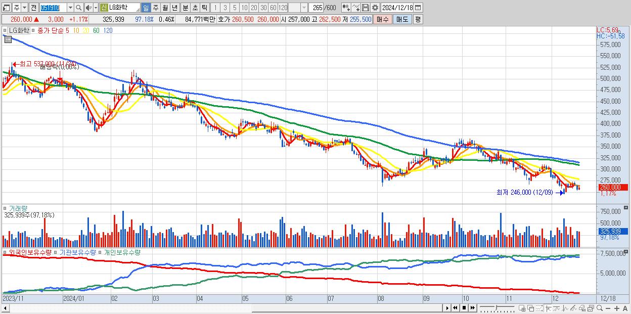 - LG화학 (260,000원 ▲ 1.17% , 시총: 183,540억, 외국인 순매수 거래금:65억)