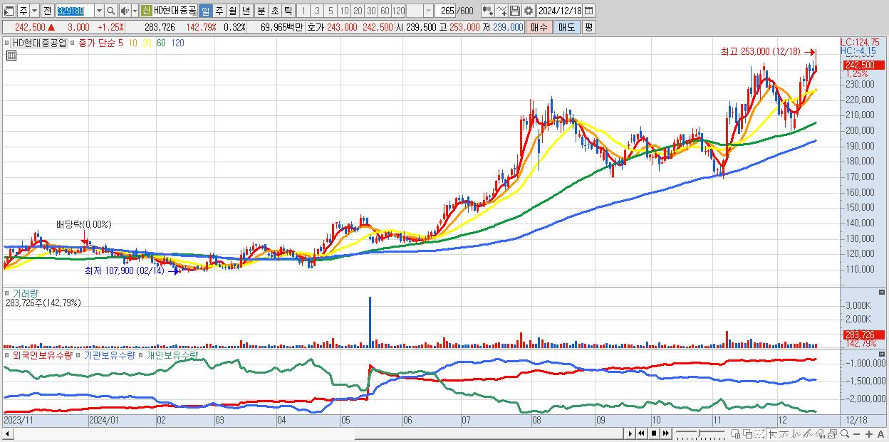 - HD현대중공업 (242,500원 ▲ 1.25% , 시총: 215,275억, 외국인 순매수 거래금:60억)