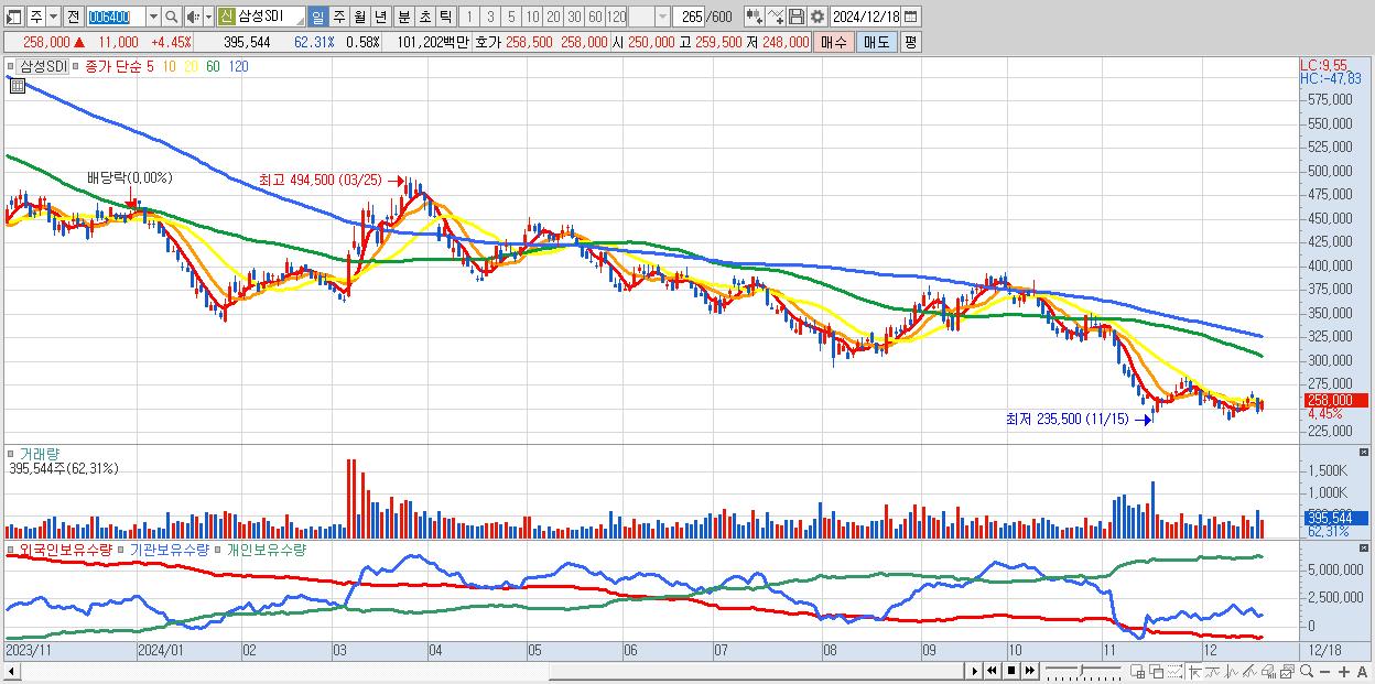 - 삼성SDI (258,000원 ▲ 4.45% , 시총: 177,412억, 외국인 순매수 거래금:301억)