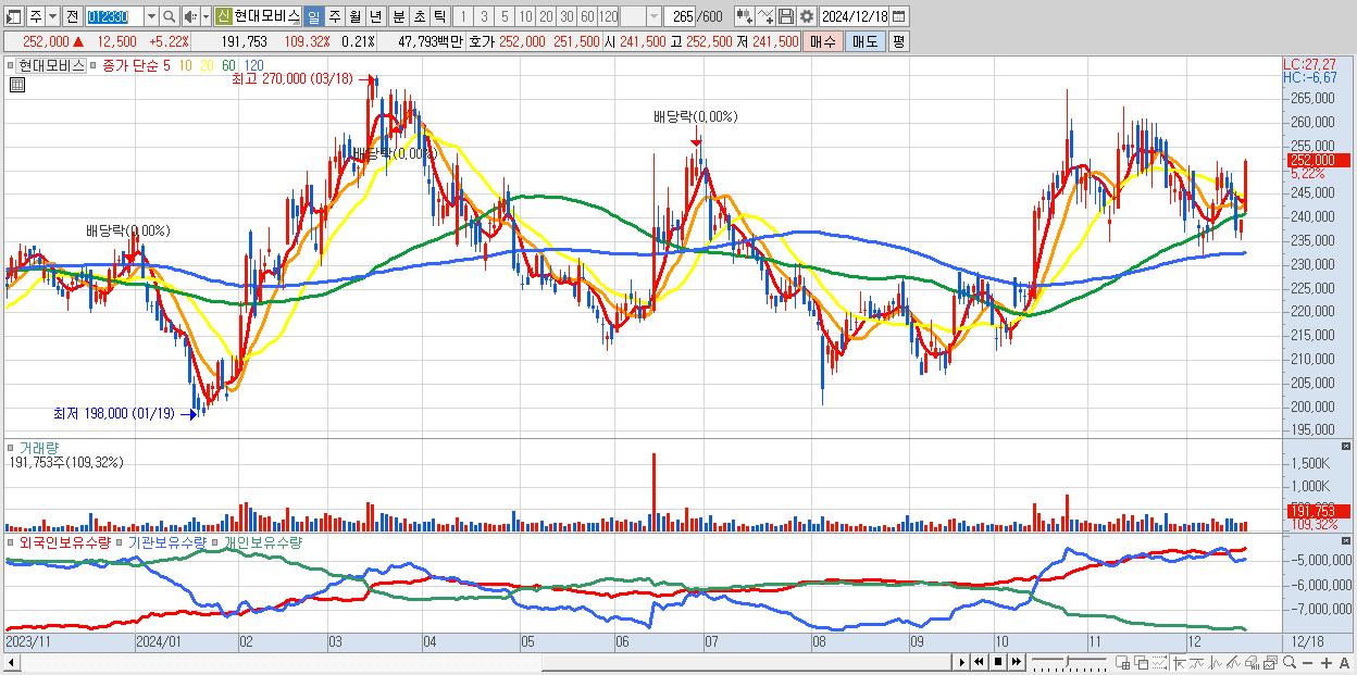 - 현대모비스 (252,000원 ▲ 5.22% , 시총: 234,348억, 외국인 순매수 거래금:145억)