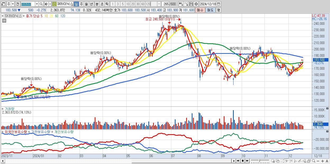 - SK하이닉스 (183,500원 ▼ -0.27% , 시총: 1,335,884억, 외국인 순매수 거래금:215억)