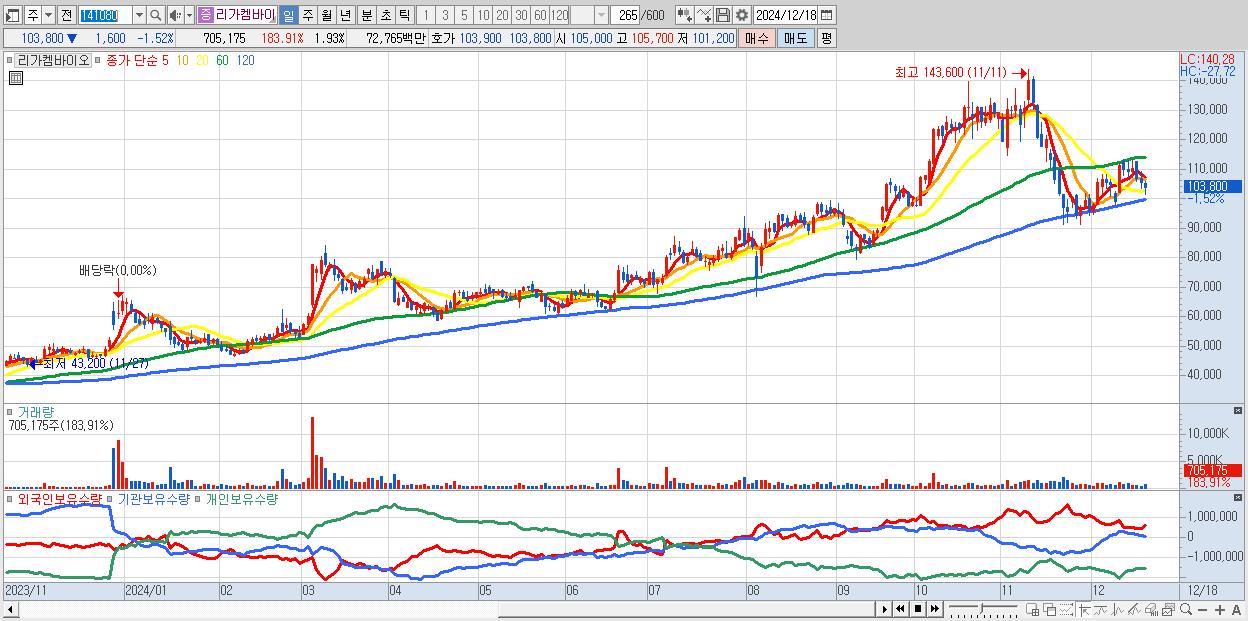 - 리가켐바이오 (103,800원 ▼ -1.52% , 시총: 38,002억, 외국인 순매수 거래금:77억)