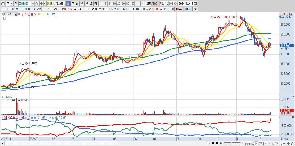 - LIG넥스원 (196,600원 ▼ -4.79% , 시총: 43,252억, 외국인 순매수 거래금:1,176억)