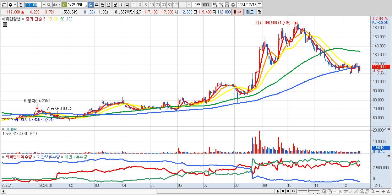 - 유한양행 (117,000원 ▲ 3.72% , 시총: 93,845억, 외국인 순매수 거래금:227억)