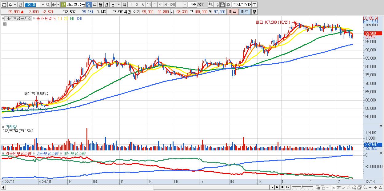 - 메리츠금융지주 (99,900원 ▲ 2.67% , 시총: 190,529억, 외국인 순매수 거래금:45억)