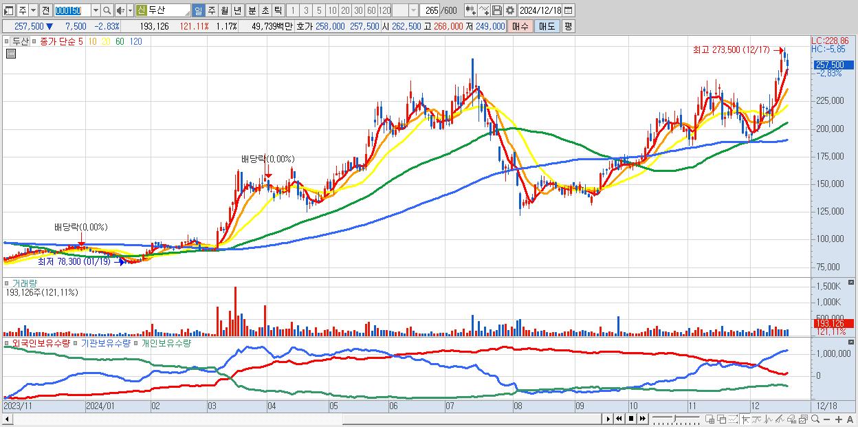 - 두산 (257,500원 ▼ -2.83% , 시총: 42,549억, 외국인 순매수 거래금:67억)