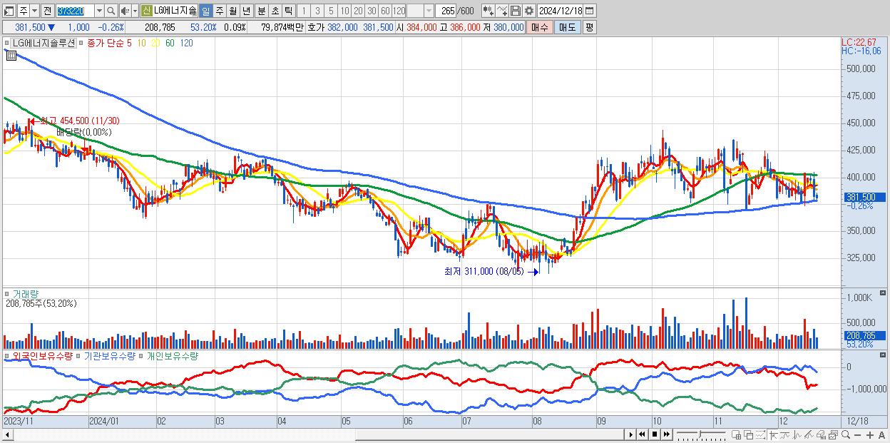 - LG에너지솔루션 (381,500원 ▼ -0.26% , 시총: 892,710억, 외국인 순매수 거래금:165억)