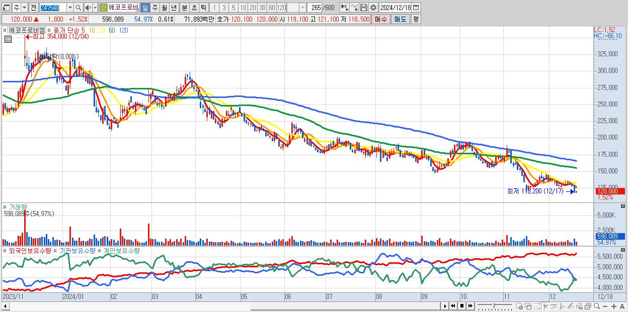 - 에코프로비엠 (120,000원 ▲ 1.52% , 시총: 117,362억, 외국인 순매수 거래금:188억)