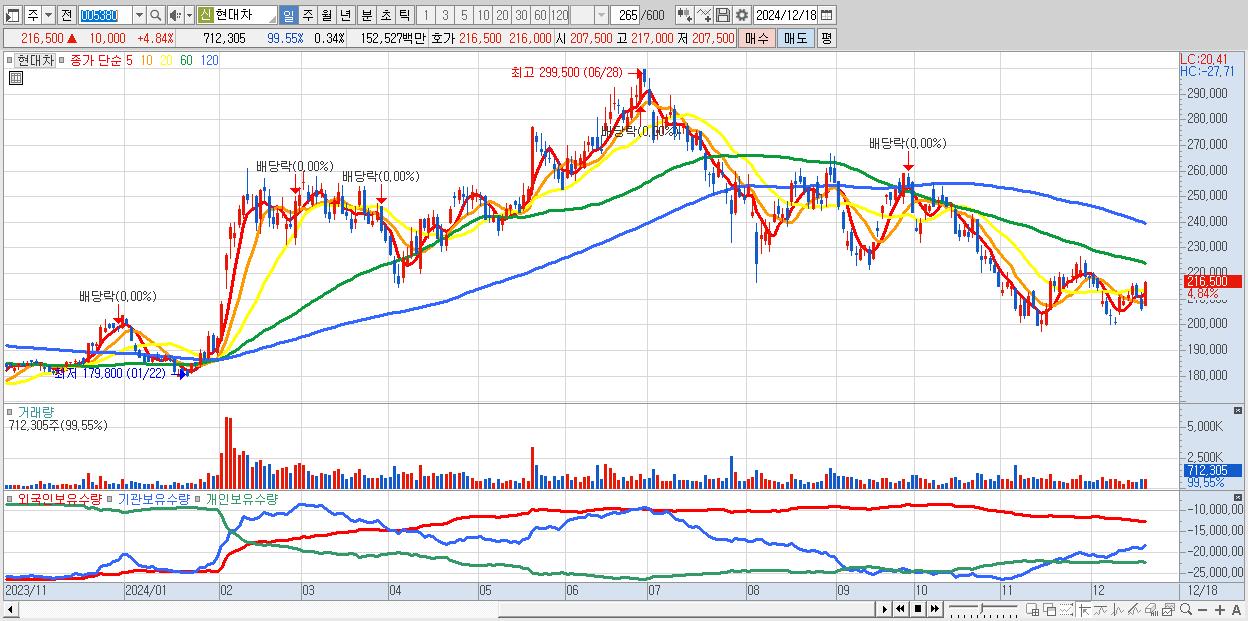 - 현대차 (216,500원 ▲ 4.84% , 시총: 453,386억, 외국인 순매수 거래금:252억)