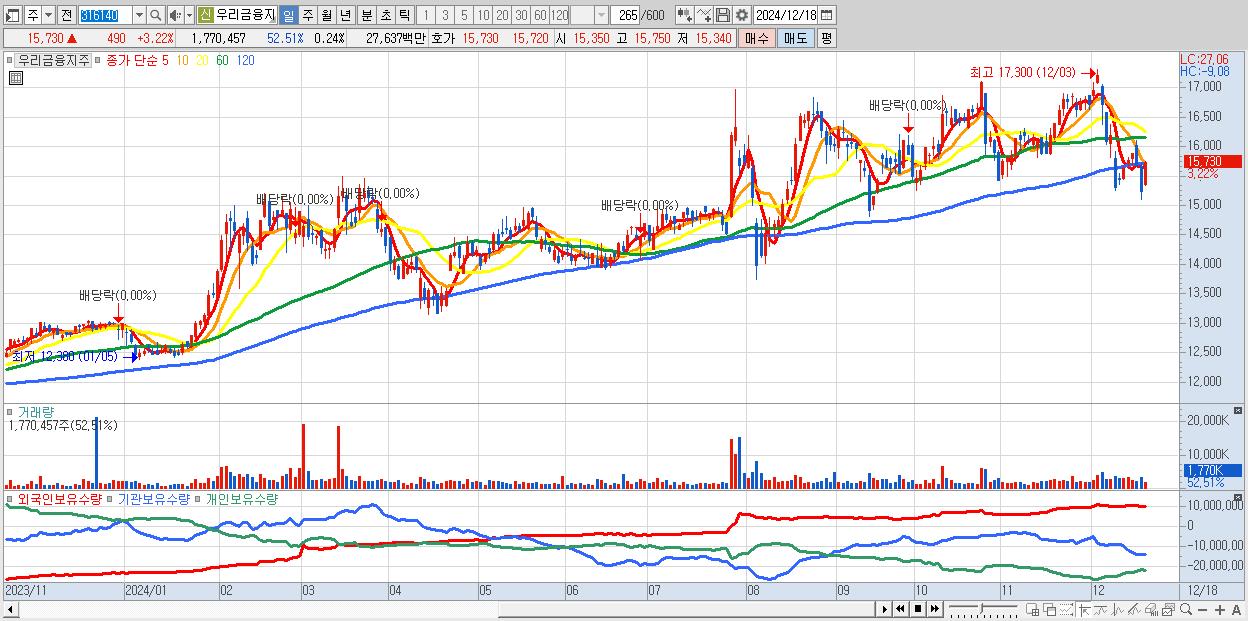 - 우리금융지주 (15,730원 ▲ 3.22% , 시총: 116,810억, 외국인 순매수 거래금:45억)