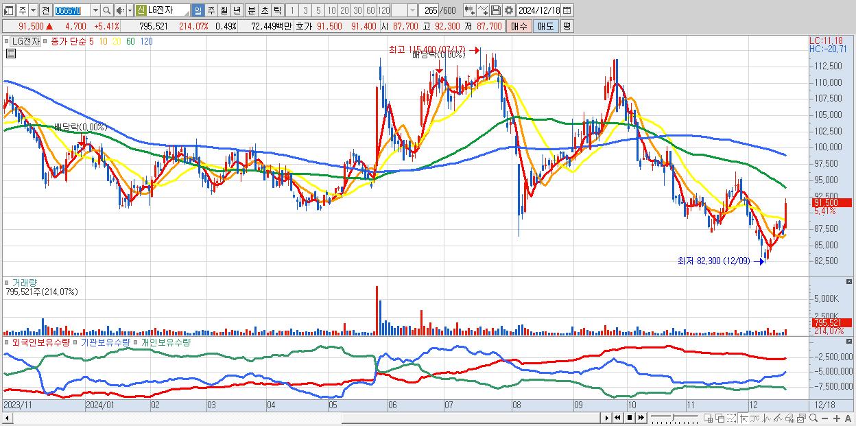 - LG전자 (91,500원 ▲ 5.41% , 시총: 149,738억, 외국인 순매수 거래금:192억)