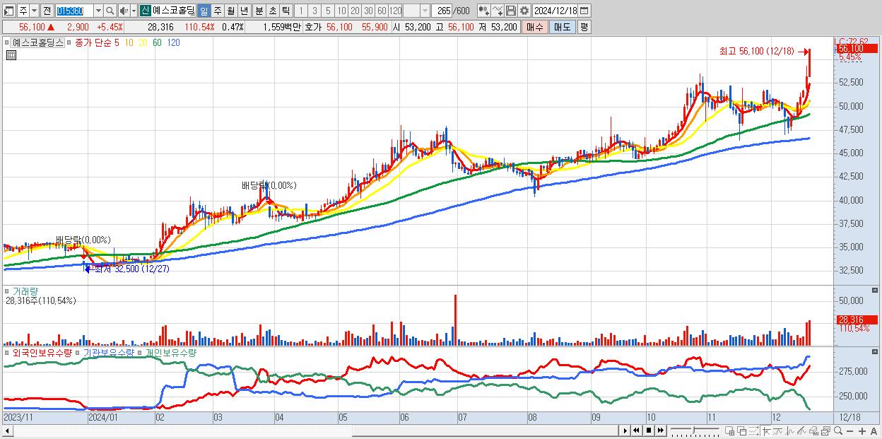 - 예스코홀딩스 (56,100원 ▲ 5.45% , 시총: 3,366억, 거래량: 28,316, 거래대금:16억, KOSPI)