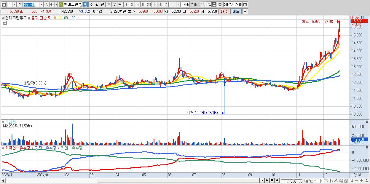 - 현대그린푸드 (15,890원 ▲ 4.33% , 시총: 5,384억, 거래량: 142,230, 거래대금:22억, KOSPI)