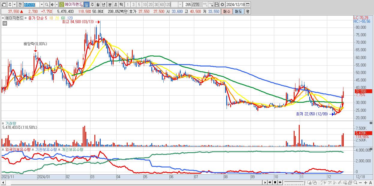 - 에이직랜드 (37,550원 ▲ 7.75% , 시총: 4,045억, 거래량: 5,478,403, 거래대금:2,081억)