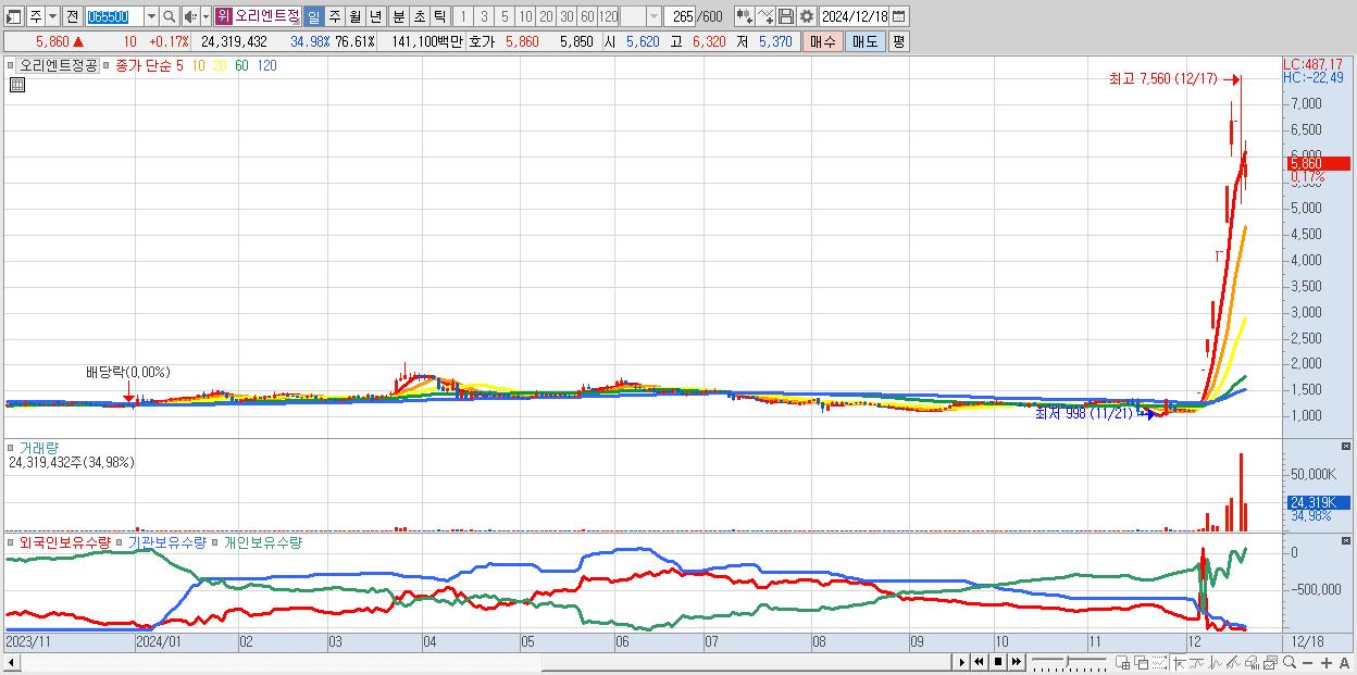 - 오리엔트정공 (5,860원 ▲ 0.17% , 시총: 1,860억, 거래량: 24,319,432, 거래대금:1,411억)