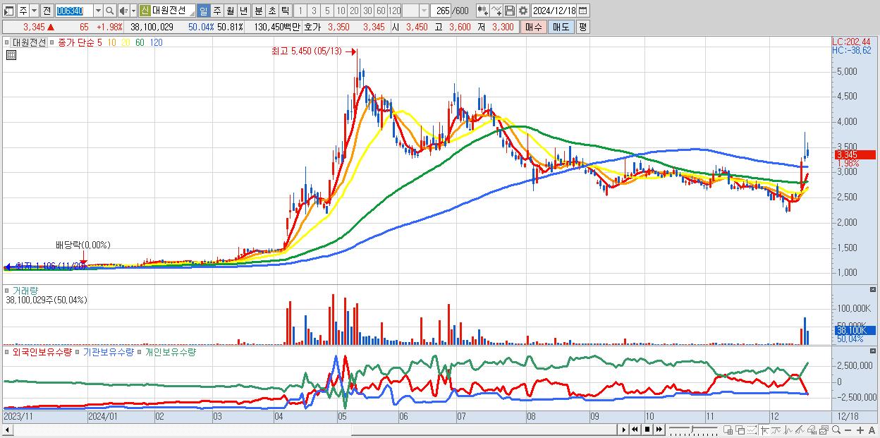 - 대원전선 (3,345원 ▲ 1.98% , 시총: 2,508억, 거래량: 38,100,029, 거래대금:1,304억)