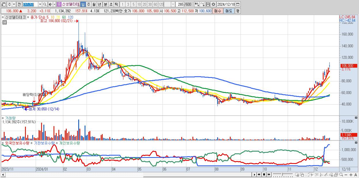 - 신성델타테크 (106,000원 ▲ 3.11% , 시총: 29,133억, 거래량: 1,134,392, 거래대금:1,212억)