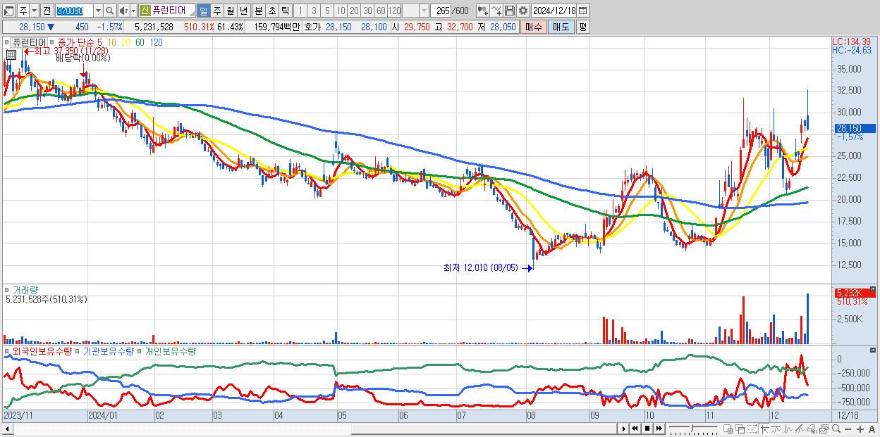 - 퓨런티어 (28,150원 ▼ -1.57% , 시총: 2,397억, 거래량: 5,231,528, 거래대금:1,598억)