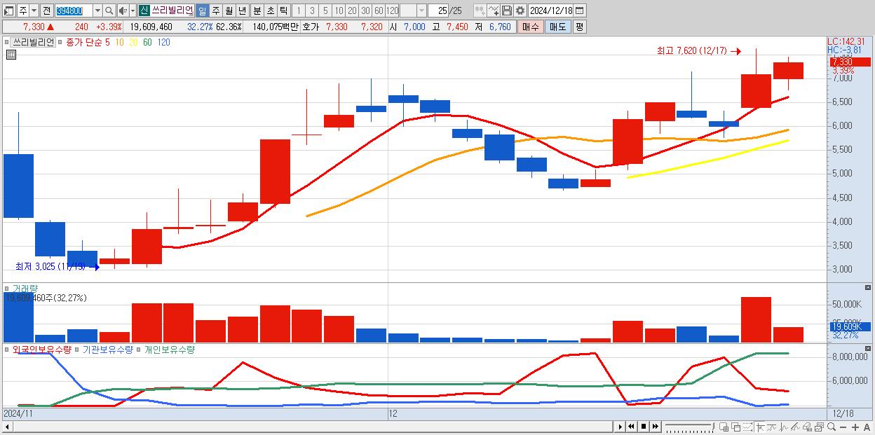 - 쓰리빌리언 (7,330원 ▲ 3.39% , 시총: 2,305억, 거래량: 19,609,460, 거래대금:1,401억)