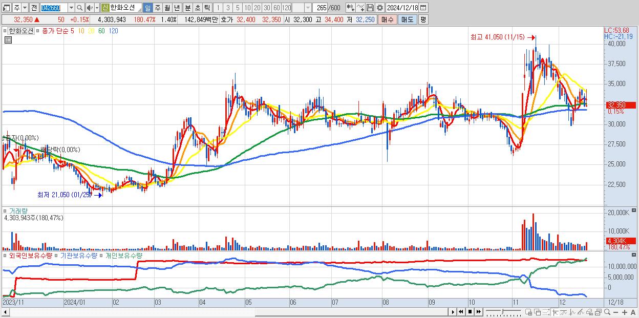 - 한화오션 (32,350원 ▲ 0.15% , 시총: 99,125억, 거래량: 4,303,943, 거래대금:1,428억)