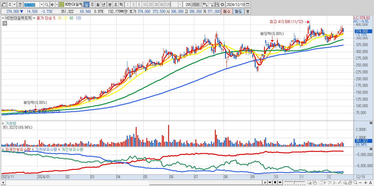 - HD현대일렉트릭 (374,000원 ▼ -3.73% , 시총: 134,816억, 거래량: 351,322, 거래대금:1,322억)
