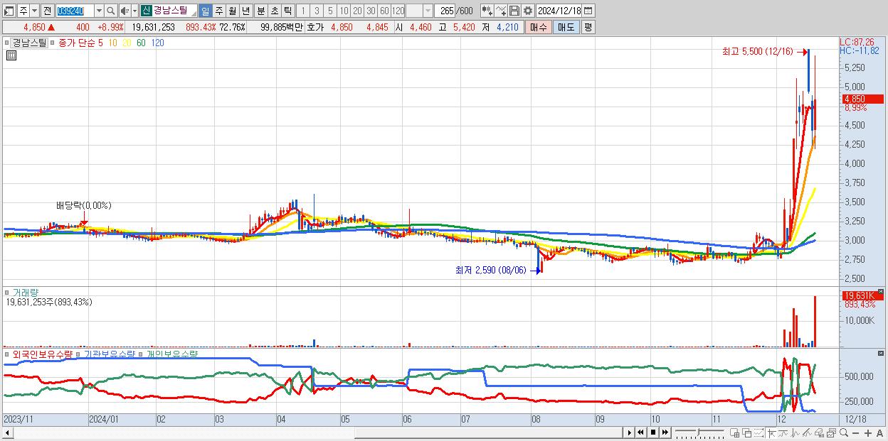 - 경남스틸 (4,850원 ▲ 8.99% , 시총: 1,309억, 거래량: 19,631,253, 거래대금:999억)