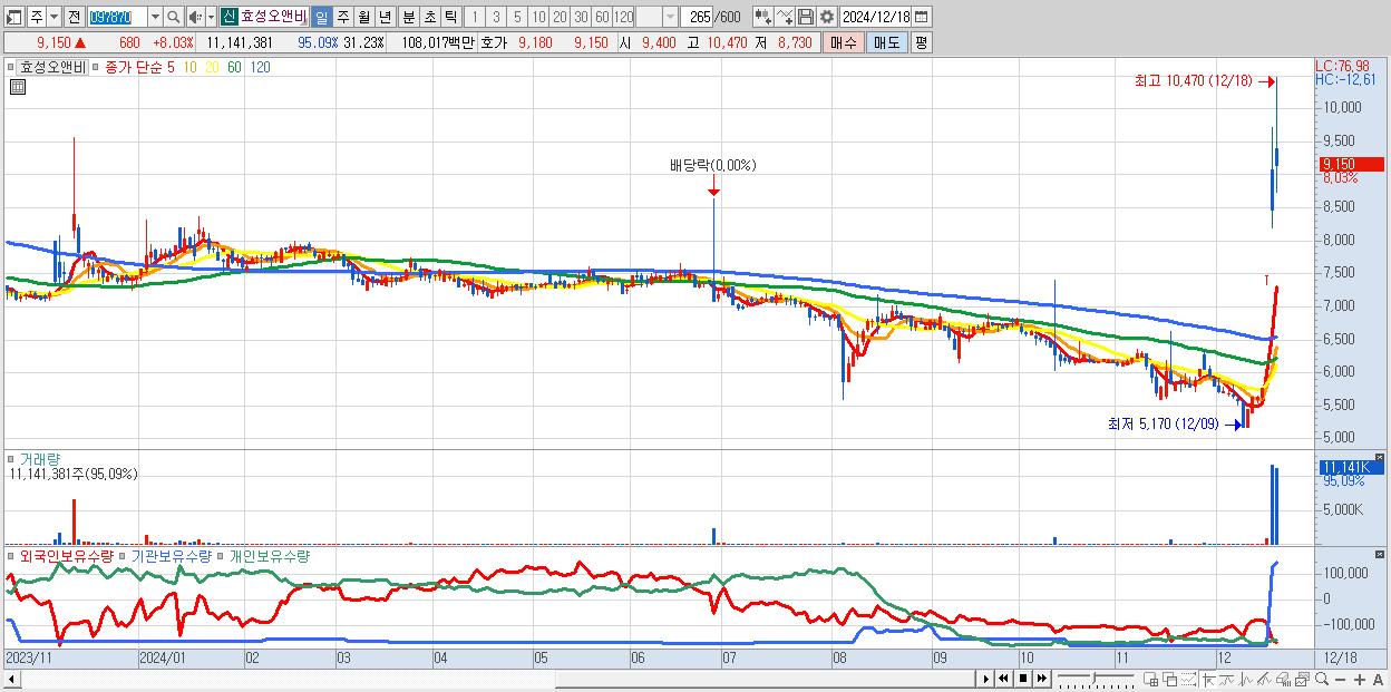 - 효성오앤비 (9,150원 ▲ 8.03% , 시총: 777억, 거래량: 11,141,381, 거래대금:1,080억)