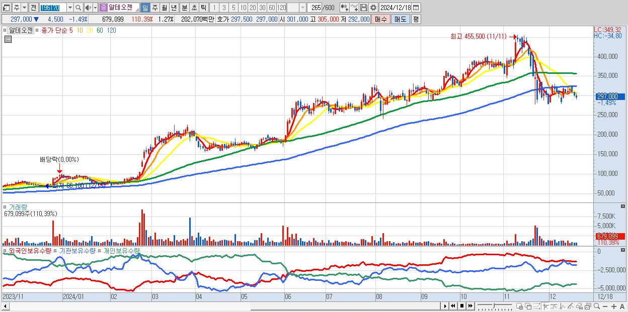 - 알테오젠 (297,000원 ▼ -1.49% , 시총: 158,357억, 거래량: 679,099, 거래대금:2,021억)