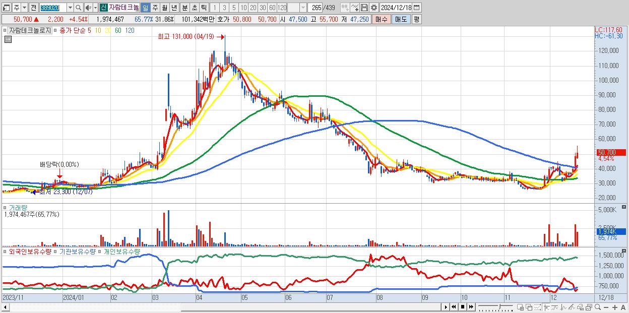 - 자람테크놀로지 (50,700원 ▲ 4.54% , 시총: 3,142억, 거래량: 1,974,467, 거래대금:1,013억)