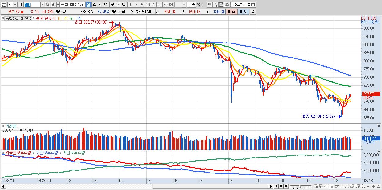 | 12/16 | 698.53 | ▲0.69% | 2,089억 | -1,147억 | -774억 | -168억 |