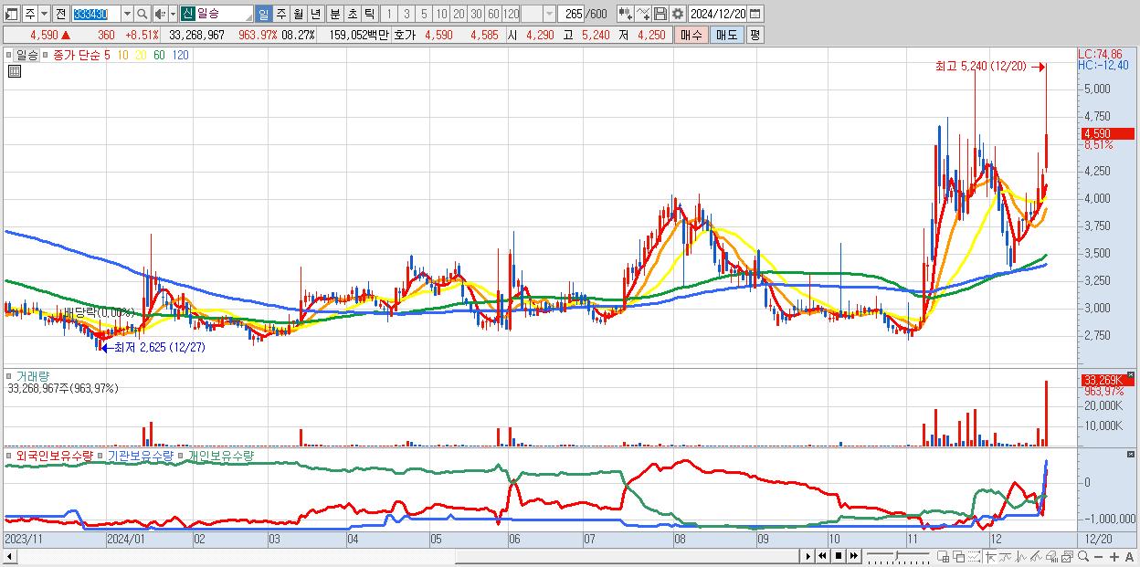 - 일승 (4,590원 ▲ 8.51% , 시총: 1,410억, 거래량: 33,268,967, 거래대금:1,591억)