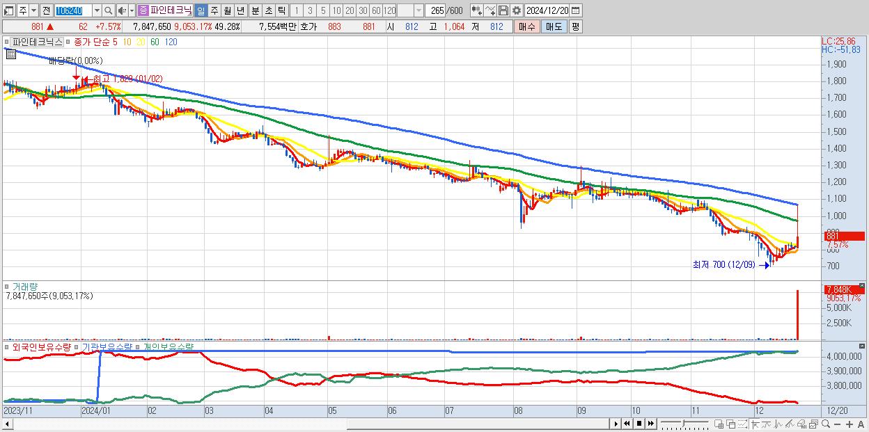 - 파인테크닉스 (881원 ▲ 7.57% , 시총: 140억, 거래량: 7,847,650, 거래대금:76억)