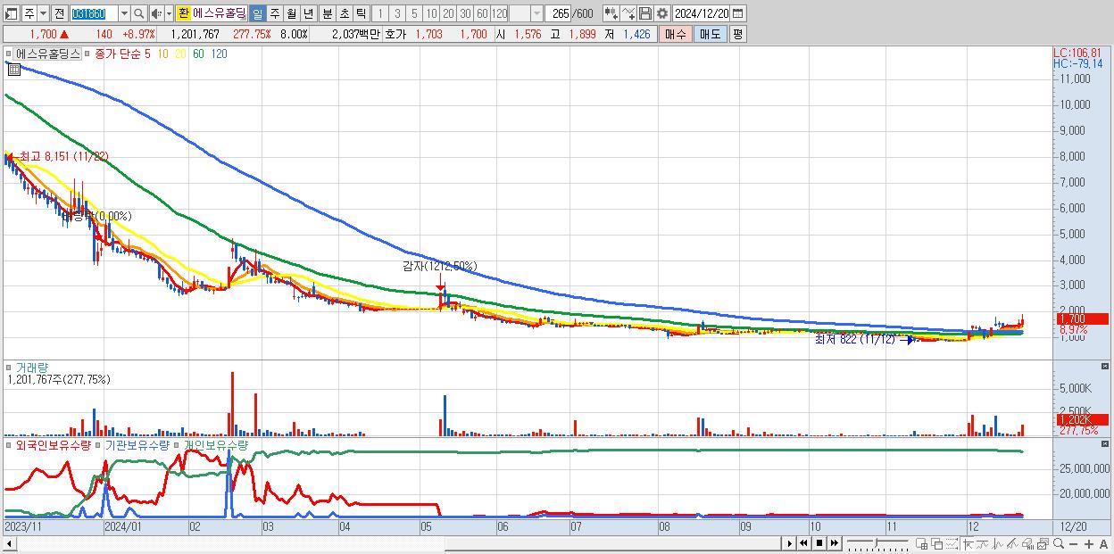 - 에스유홀딩스 (1,700원 ▲ 8.97% , 시총: 255억, 거래량: 1,201,767, 거래대금:20억)